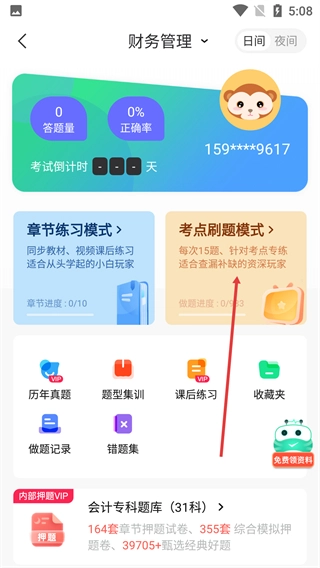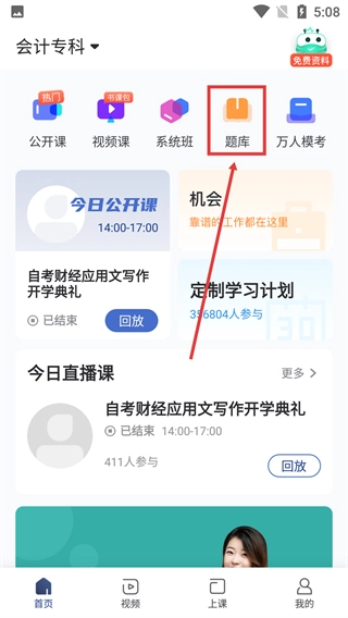 1、在【会计专科】页面,找到并点击【题库】功能按钮,即可进入题库板块。