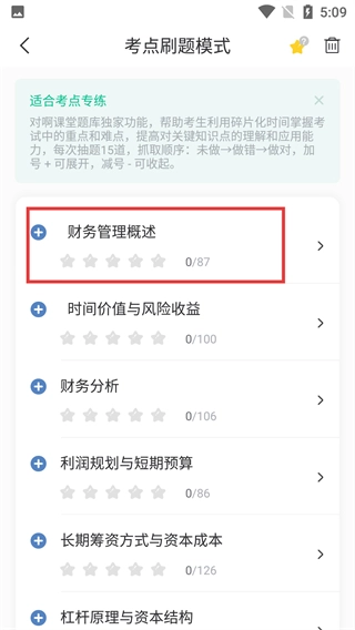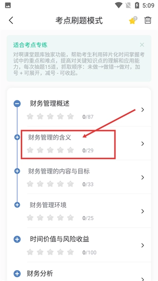 3、进入考点刷题模式页面后,找到【财务管理概述】这一考点并点击,即可展开查看其下包含的细分知识点。