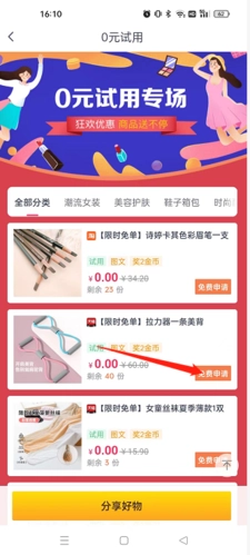 申请商品试用的话可以不花钱免费拿想要的商品;