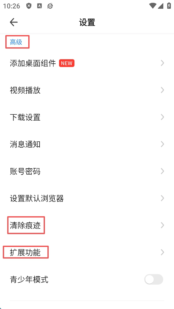 3、找到“高级”板块中的“清除痕迹”和“扩展功能”。