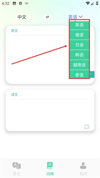 3、点击【英语】旁边的下拉按钮,就能展开语言选择列表,在里面可以挑选【俄语】、【日语】等想要的翻译语言。