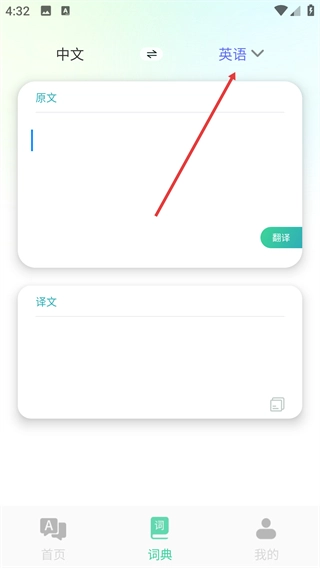 2、进入【词典】页面,该页面默认设置为【中文】翻译【英语】,你可以在原文输入框中填写需要翻译的内容。