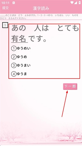 3、在漢字読み练习页面完成题目选择后,点击下一题继续答题。