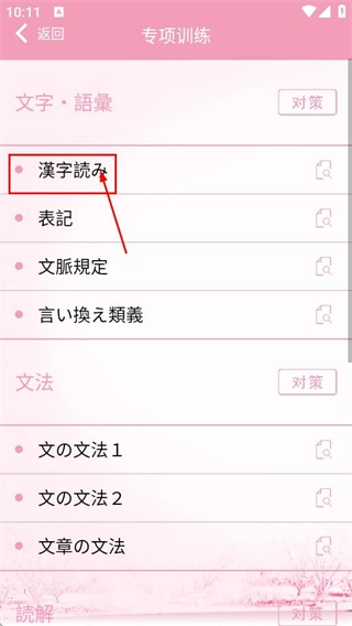 2、在专项训练页面选择漢字読み选项,进入对应练习页面。