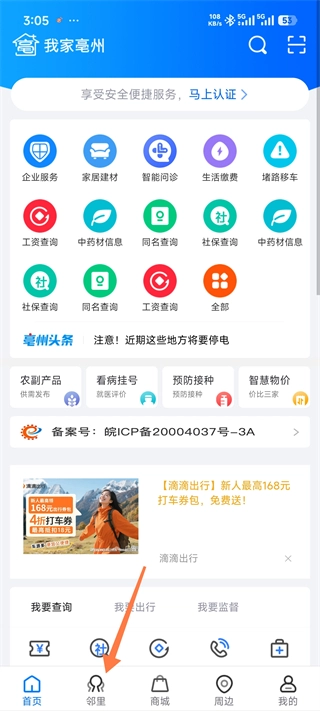 1、打开我家亳州App,点击邻里板块