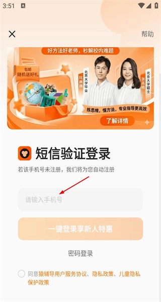 3、进入登录界面后,选择短信验证的登录方式,点击手机号输入框,准备填写相关信息以完成登录操作。
