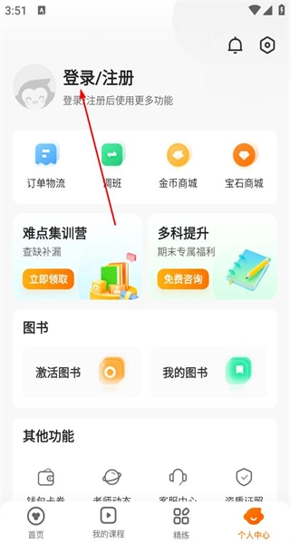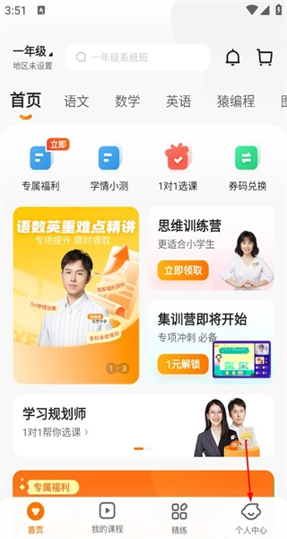 打开软件后进入首页,能看到各学科选项和学习功能,接着点击页面下方的个人中心选项,即可进入对应的页面。