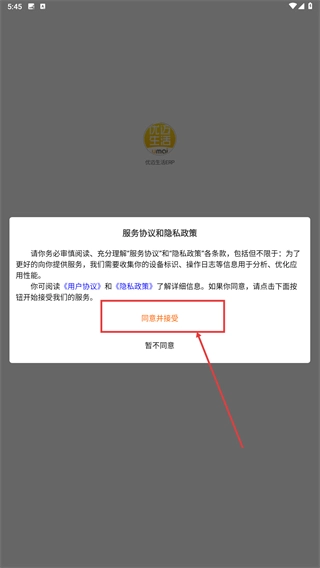 1、在服务协议和隐私政策,阅读条款后点击【同意并接受-功能按钮】。