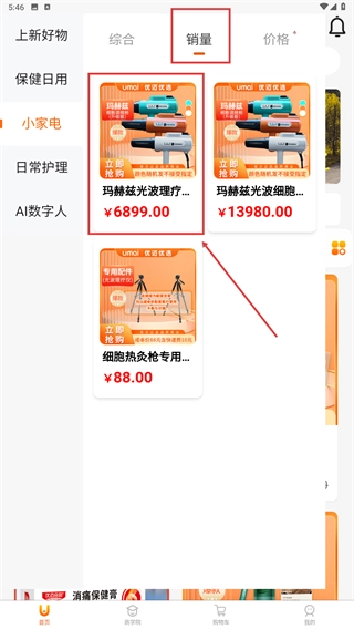 3、在分类选择目标品类,进入对应商品页面,点击【销量-排序按钮】按销量排序商品。可点击【立即抢购-功能按钮】进行购买操作。