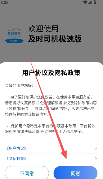 1、阅读完整用户协议及隐私政策,点击同意进入。