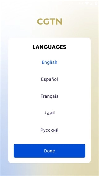 1、在本站并安装CGTN客户端后,初次运行需要选择语言类型,软件共支持五种语言,分别是英语、西班牙语、法语、阿拉伯语和俄语。
