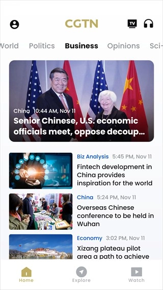 4、进入CGTN后,你将看到Home主页及导航菜单,浏览不同的新闻类别、专题报道或视频内容,通过滑动或点击进行浏览。