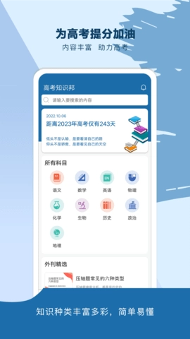 高考知识邦作为一款作业题库类软件,为高中学生提供了全面且详细的学习资源支持。其内容覆盖了高考语文、数学、英语、物理、化学、生物、历史、政治、地理这九大科目的知识点,并针对各知识点进行了分类详解。