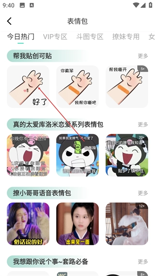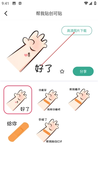 3、在表情包分类页面挑选目标系列(例如【帮我贴创可贴】),点击对应的表情包就能进入该系列的详情页面。
