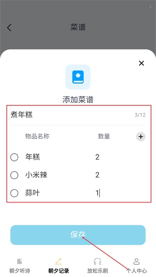 4、在【添加菜谱】弹窗里,把菜谱名称和食材信息填写好,接着点击【保存】按钮,就能完成菜谱记录了。