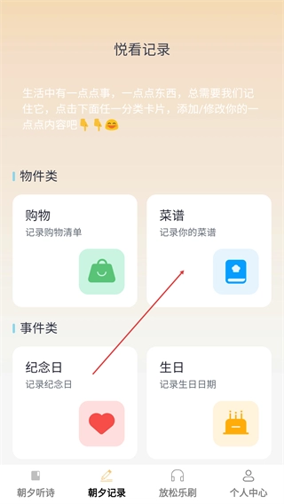 2、进入【朝夕记录】页面后,在【物件类】板块里找到【菜谱】分类并点击,就能进入菜谱记录页面。