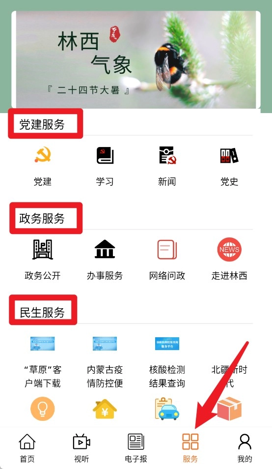 “服务”页面涵盖党建、政务与民生服务板块,具备办事咨询、疫情查询等功能。
