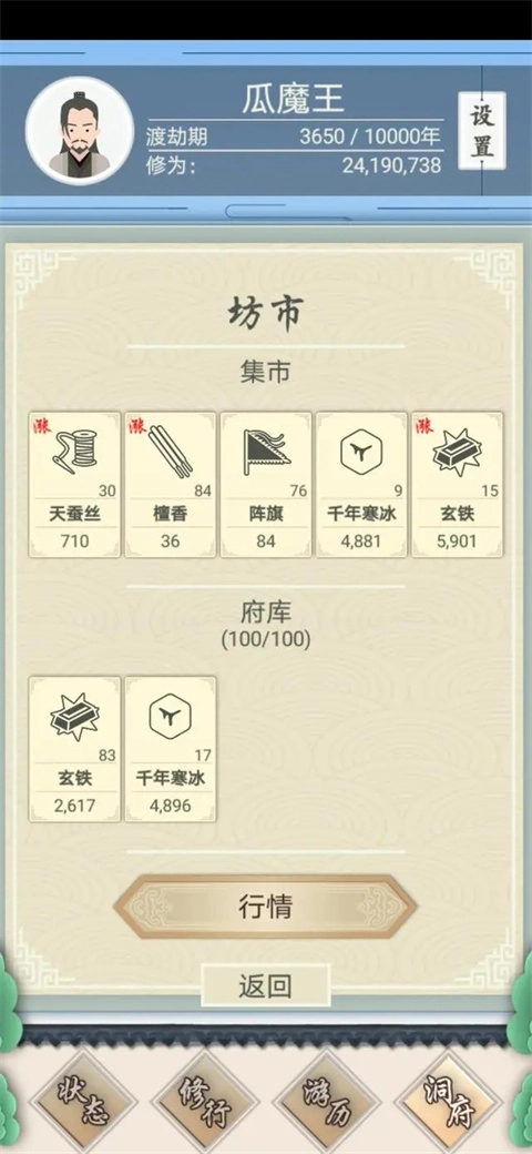 中前期:祝贺你,正式开启该游戏的经商倒卖环节。此阶段的主要收益来自坊市货物的低买高卖,运气不错的话能大赚一笔,体验相当畅快。小小的坊市蕴含着不少炒股思维,府库最多可存放5种商品,坊市单次刷新也最多出现5种商品。