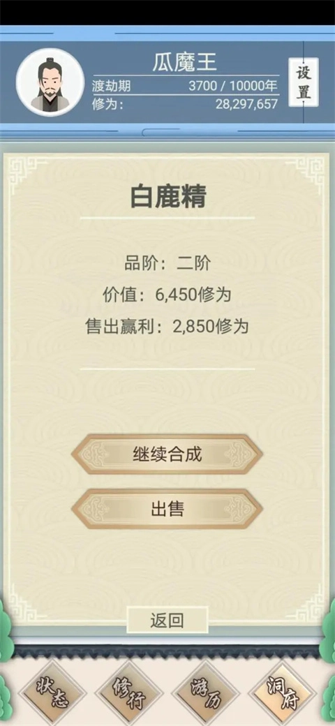 所以最划算的做法是每次选两个猫妖合成,合成白鹿精后就卖掉。等有了仙树,每轮那几千修为的收益就显得比较小了,加上操作起来又麻烦又费时间,我通常就直接放弃这种做法了。