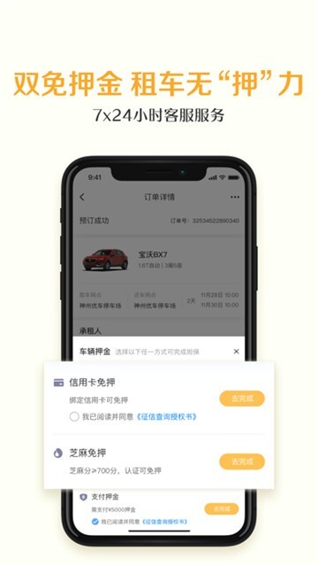 绑卡或芝麻分600分及以上,享受租车预授权+违章押金双重免押服务。
