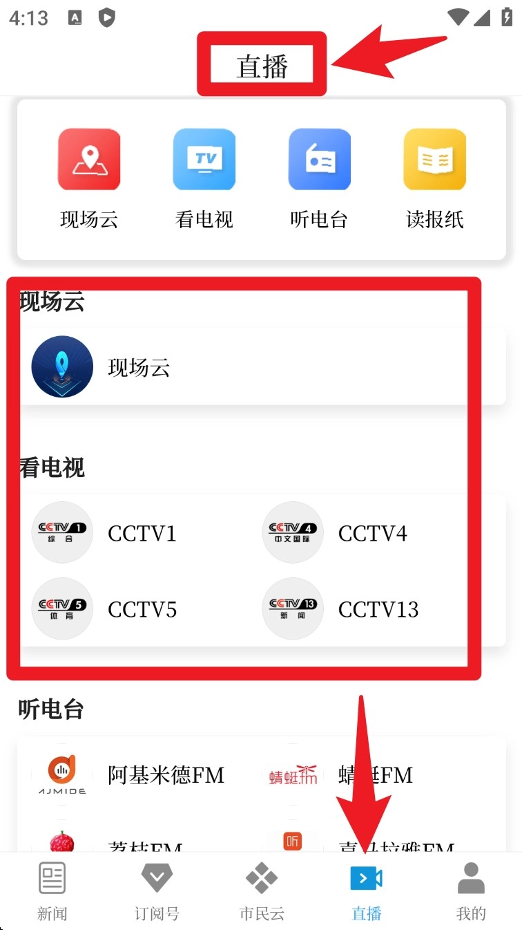 用户点击底部的“直播”页签后,就能选择“看电视”“听电台”等直播资源,进行实时的收看或收听。