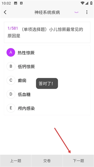 作答正确后,界面会出现【答对了!】的提示,这时候可以点击【下一题】按钮,继续进行章节练习。
