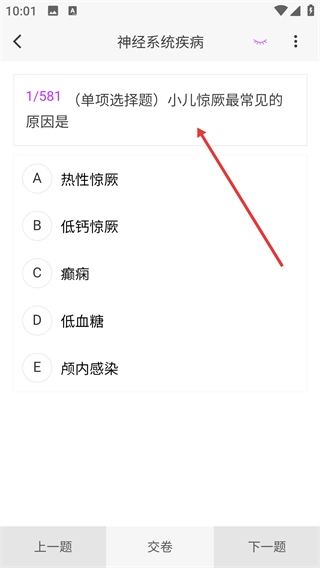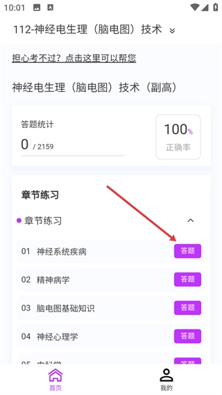在科目主界面,找到【章节练习】模块里对应的具体章节(例如【01-神经系统疾病】),点击该章节右侧的【答题】按钮,即可进入练习页面。