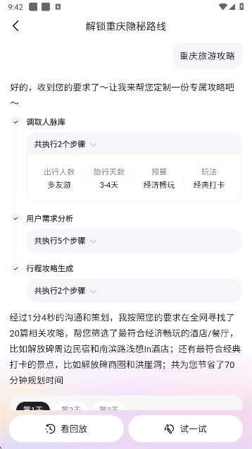 沉浸式行程规划服务:用户仅需输入一句需求,系统即可生成完整的旅行攻略,还能联动动态地图直观呈现路线;同时,数字人导游会引导用户选定行程天数、预算范围与游玩方式,进一步增强“身临其境”的决策体验。
