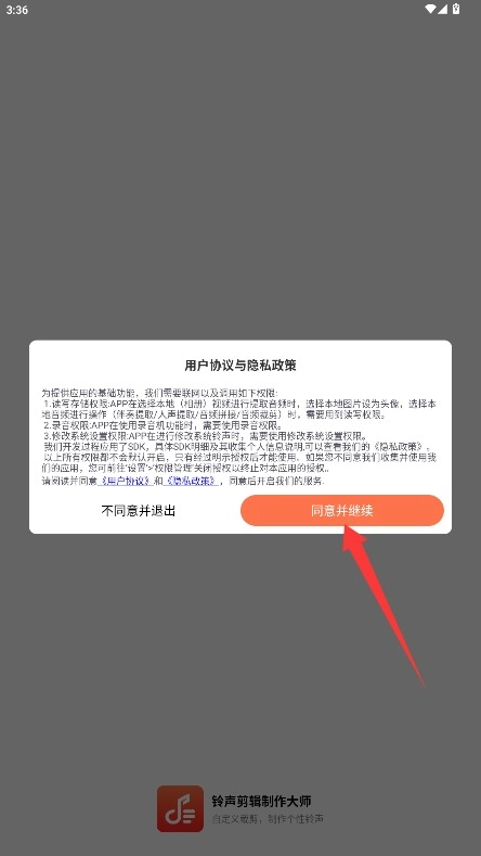 首次使用时,请仔细阅读平台的服务条款和隐私政策,确认无误后点击“同意并继续”按钮,即可进入登录界面。