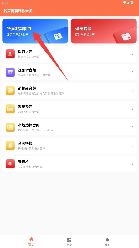 成功进入主功能界面后,点击“铃声裁剪制作”功能按钮,即可进入专业音频编辑操作页面。