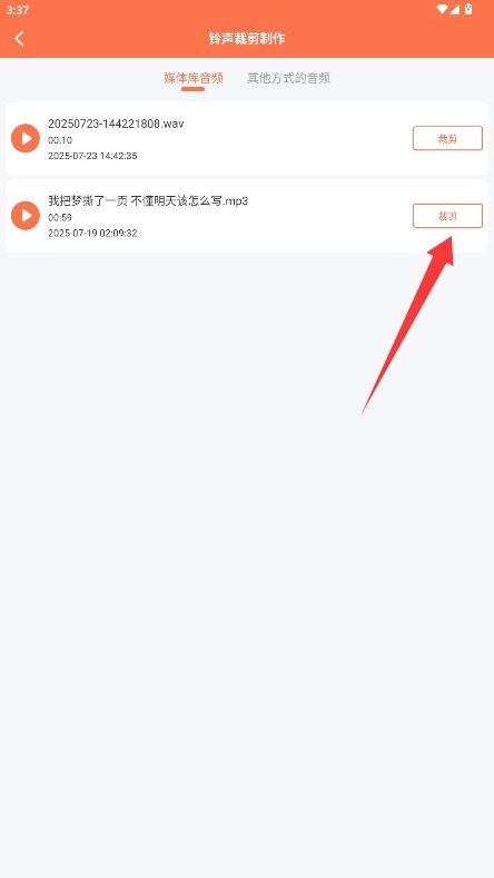 从本地音乐资源库中挑选目标音频,点击裁剪功能进入操作界面,使用裁剪工具完成裁剪后保存为铃声。