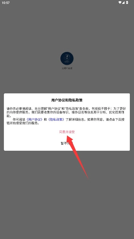 首次使用时,请仔细阅读平台的服务条款和隐私政策,在确认无误后,点击“同意并接受”按钮即可进入应用。