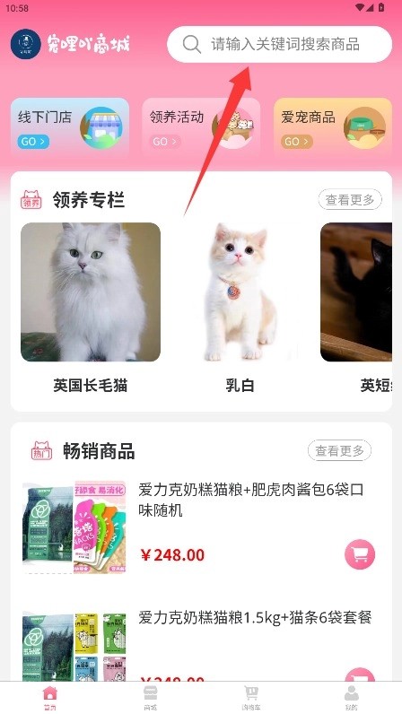 若想查找所需的宠物商品,可在商城页面顶部的搜索栏中输入商品名称或者相关关键词进行搜索。