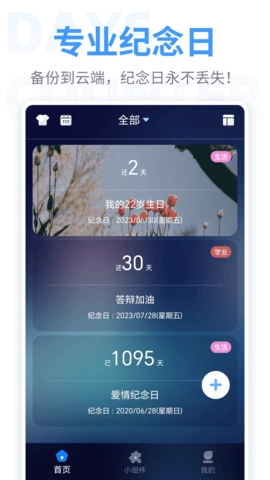 这款应用不仅可以记录恋爱的天数,还能显示已经过去了多少天。你可以清楚地知道你们的恋爱已经持续了多久,这对于情侣们来说是非常有意义的。你可以把软件当作一个恋爱计时器,每天都能看到你们的爱情在不断增长。除了记录恋爱天数,软件还可以记录其他重要的纪念日。无论是情侣纪念日,还是其他重要的纪念日,你都可以在软件中找到它们的位置。你不会忘记任何一个重要的日子,而且还能通过倒数日功能来提醒自己还有多少天就要到达这个特殊的日子。
