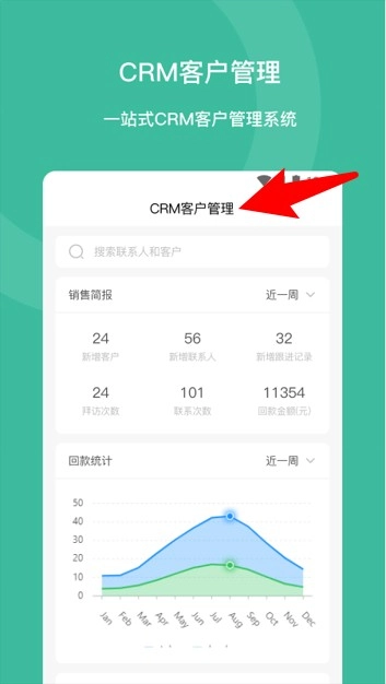 CRM客户管理模块具备客户数据查询、销售简报查看以及回款统计图表查看的功能。