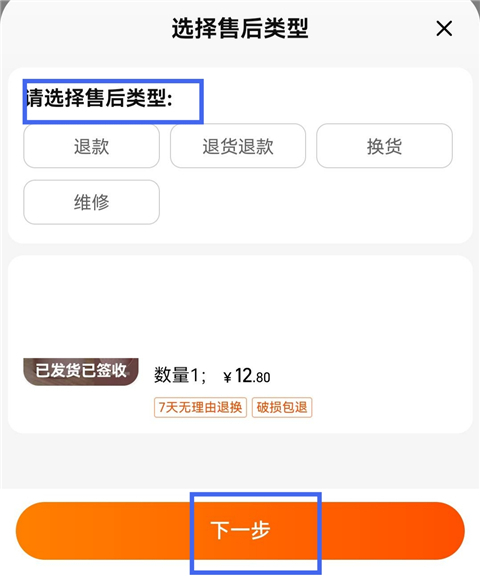 3、选择售后类型,点击【下一步】。