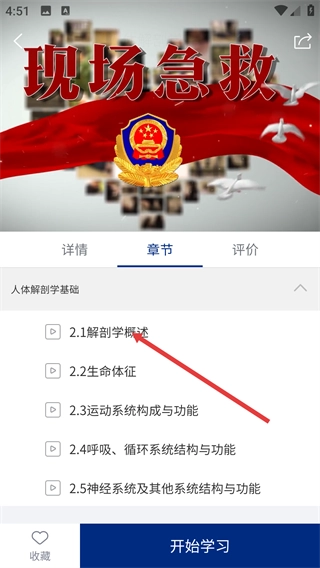 4、在课程【章节】标签下,可看到【2.1解剖学概述】-【2.2生命体征】等章节内容,准备好后点击【开始学习】进行课程学习。