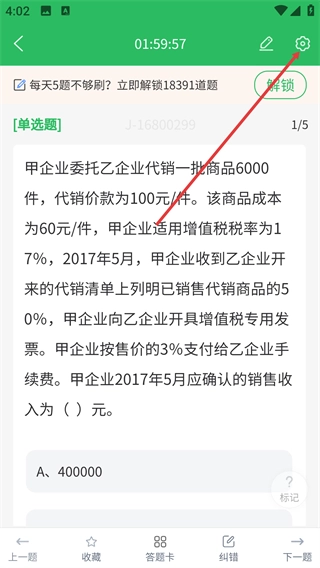 进入题目页面后,你能看到【单选题】的题干内容,另外点击右上角的设置图标,就能打开学习设置的相关功能选项。