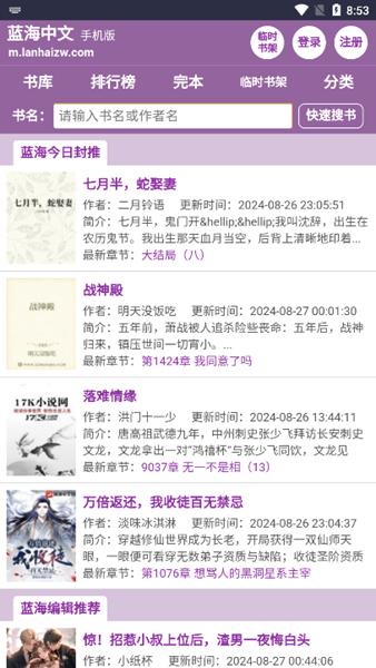 蓝海搜书app正版最新版以真正小巧的方式打造搜书的简单方式,您可以通过软件轻松找到独赢的书籍,无论是在软件中还是下载后都可轻松阅读小说章节,为用户打造真正高效的搜索、阅读方式。