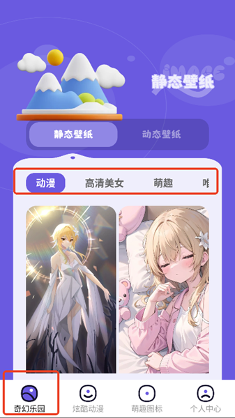 1、首先在奇幻乐园中你可以看到软件自带的所有壁纸,通过上方选项自行选择。