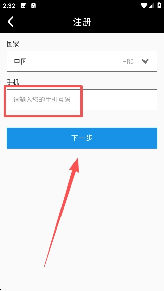 2、进入注册界面后,确认国家选择为【中国】,在 “手机” 输入框填写手机号码,点击【下一步】按钮推进注册流程。