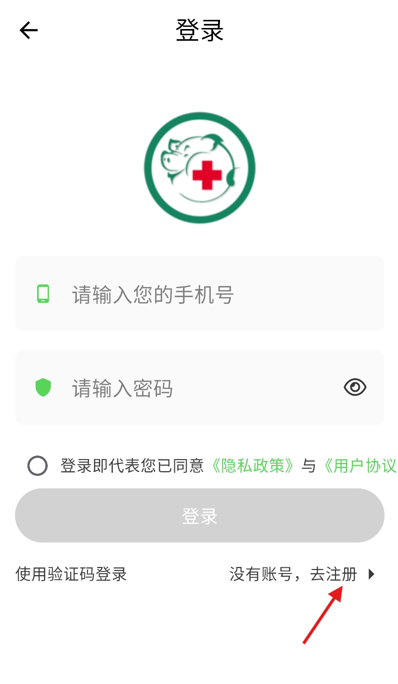 在登录界面的底部位置,能看到“没有账号,去注册”的文字提示,点击这个提示就可以进入注册页面。