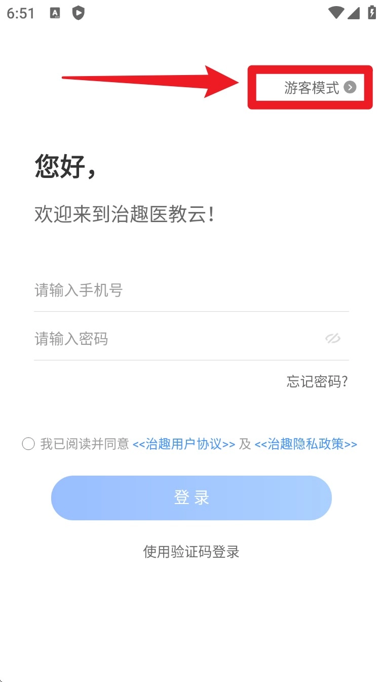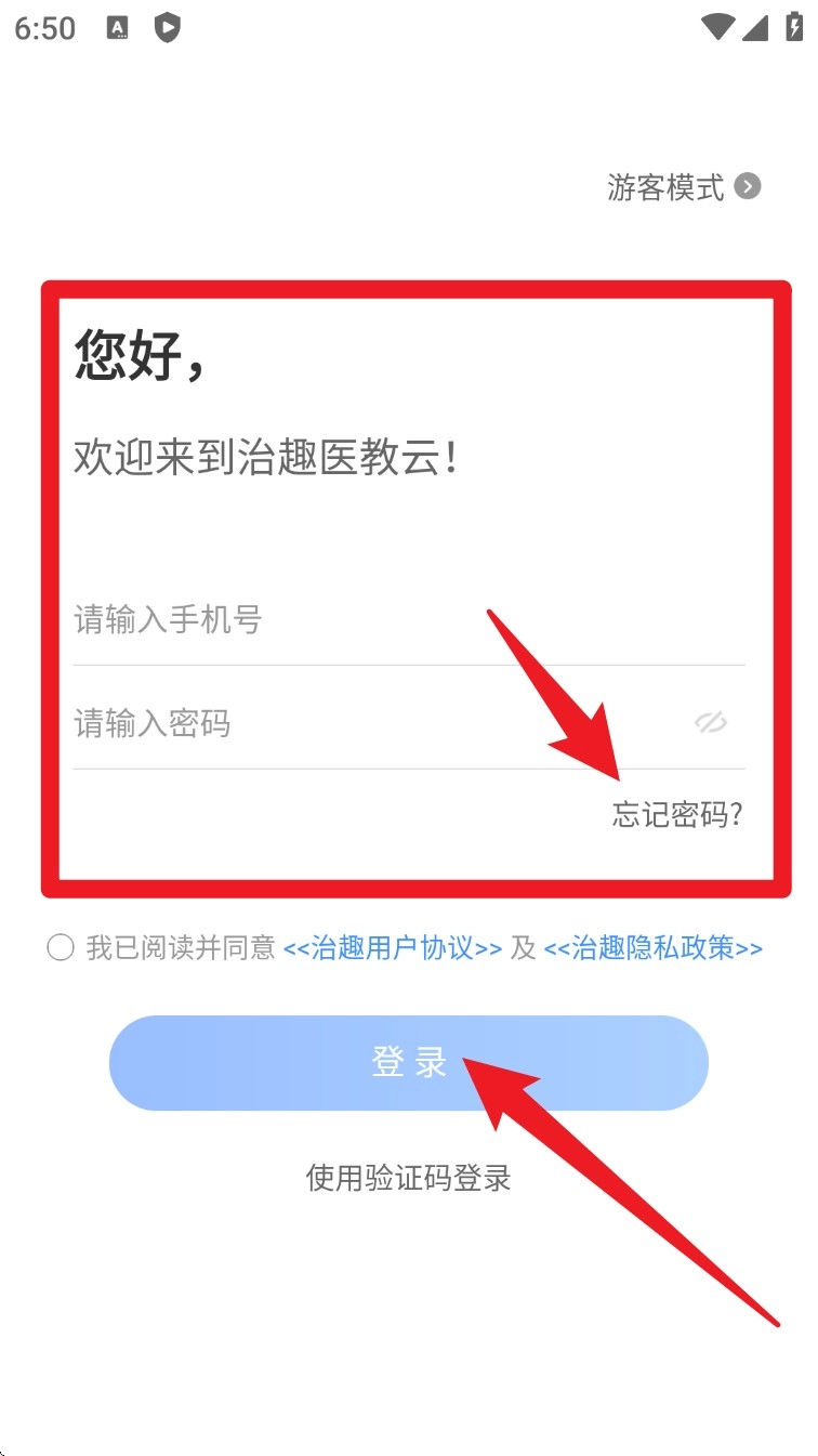 打开应用程序后进入欢迎界面,输入手机号码和密码以登录账户,或者勾选下方的协议后点击登录按键。
