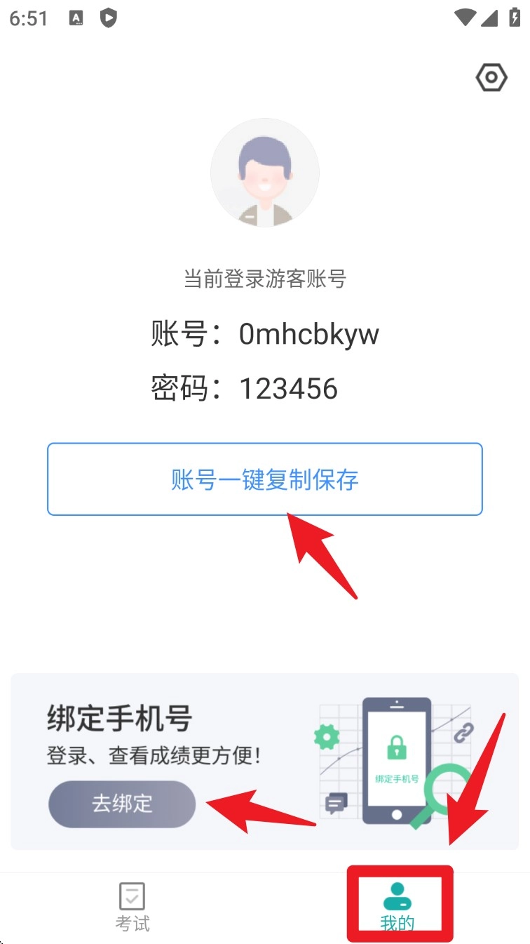 在“我的”页面能查看当前账号的相关信息,还可以一键复制游客账号,并且能选择绑定手机号来保存成绩。