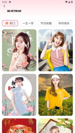 2.点击“一键换背景”功能入口进入,这里有热门、一生一世、节日祝福、伴你成长等多种模板可供选择,挑选出你喜欢的模板后,上传自己的正面照片就能开始体验啦。