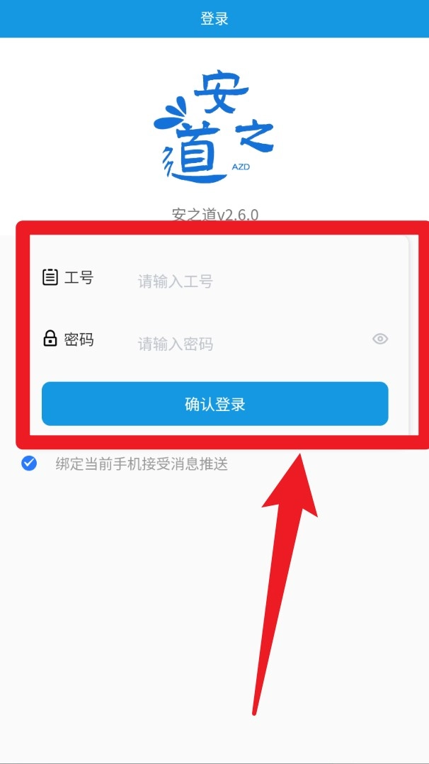 打开App后,输入工号和密码,点击“确认登录”按钮进入主页面,系统会默认绑定手机号以接收通知。