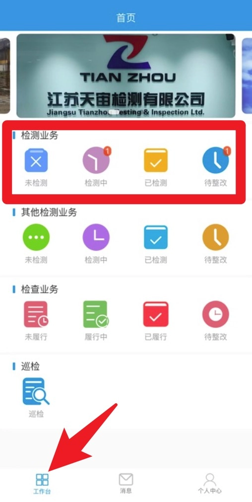登录成功后,点击底部的“工作台”,接着在“检测业务”模块里挑选不同状态的检测任务。