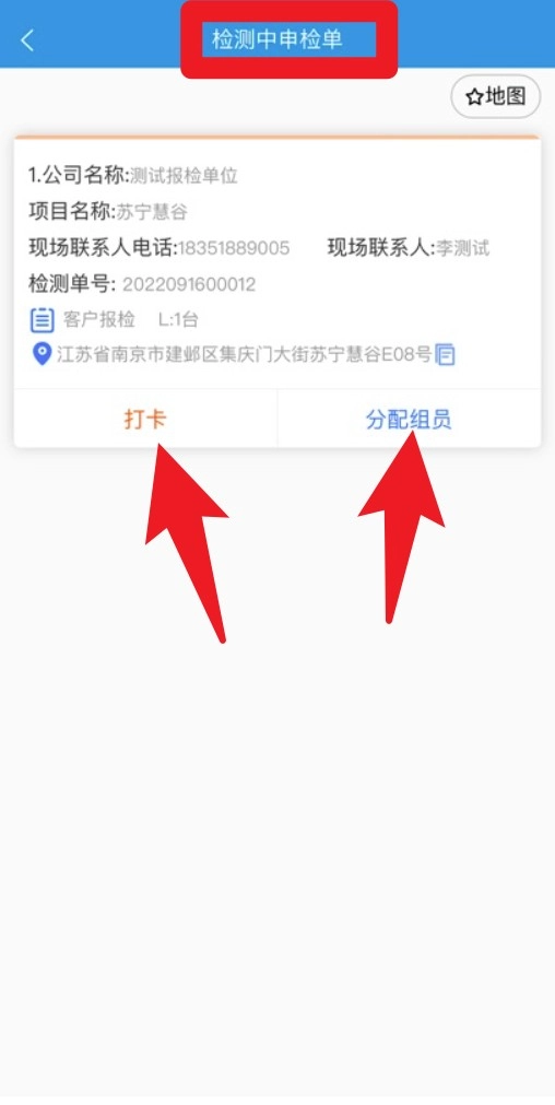 进入“检测中”任务详情页后,能够查看检测项目的相关信息,还可以执行打卡或者分配组员的操作。
