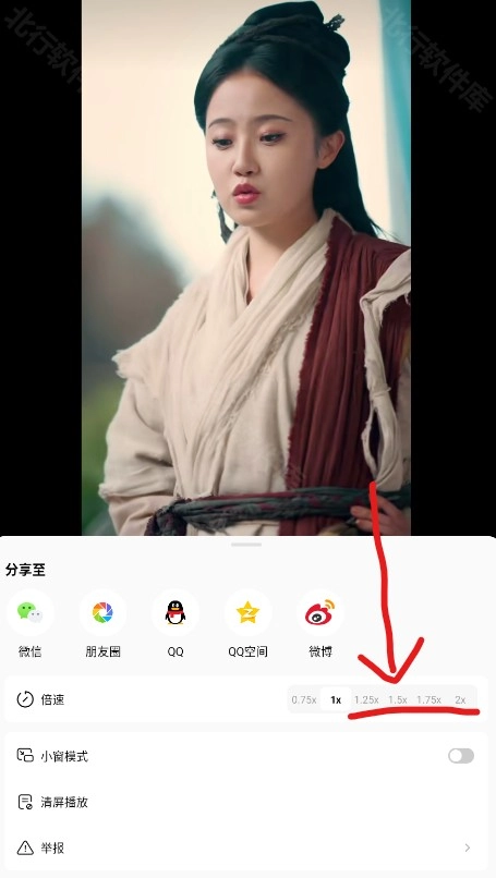 重复上述步骤1至步骤3,然后在页面下方弹出的对话框里,点击1x之后的任意一个倍速选项。