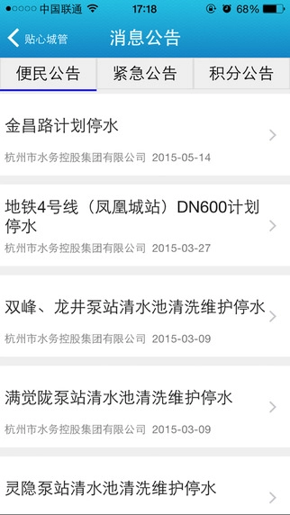 消息公告:借助“消息公告”应用,为市民提供“便民公告”“紧急公告”“积分公告”等各类公告信息服务,涵盖停水、停电、积分活动等内容。
